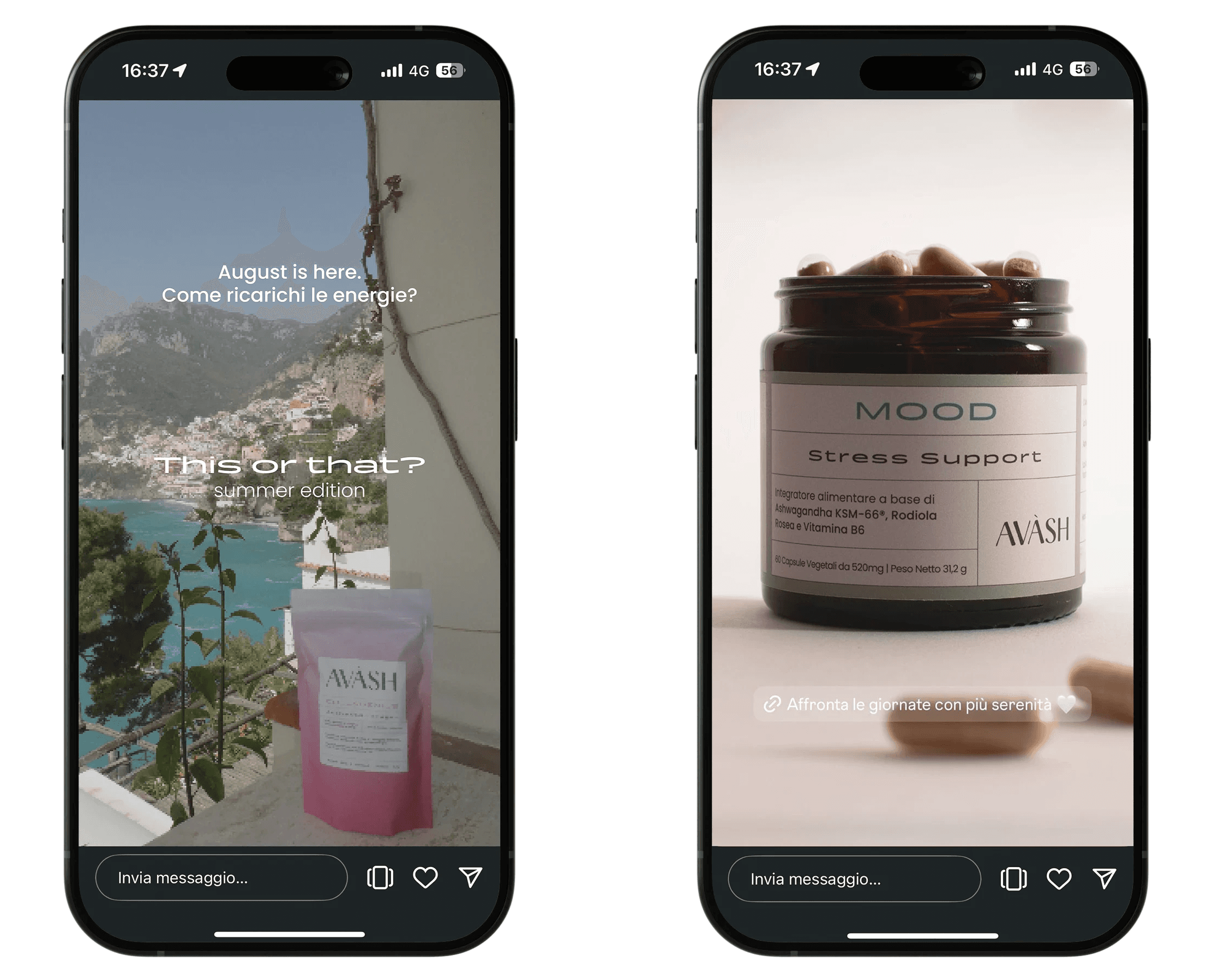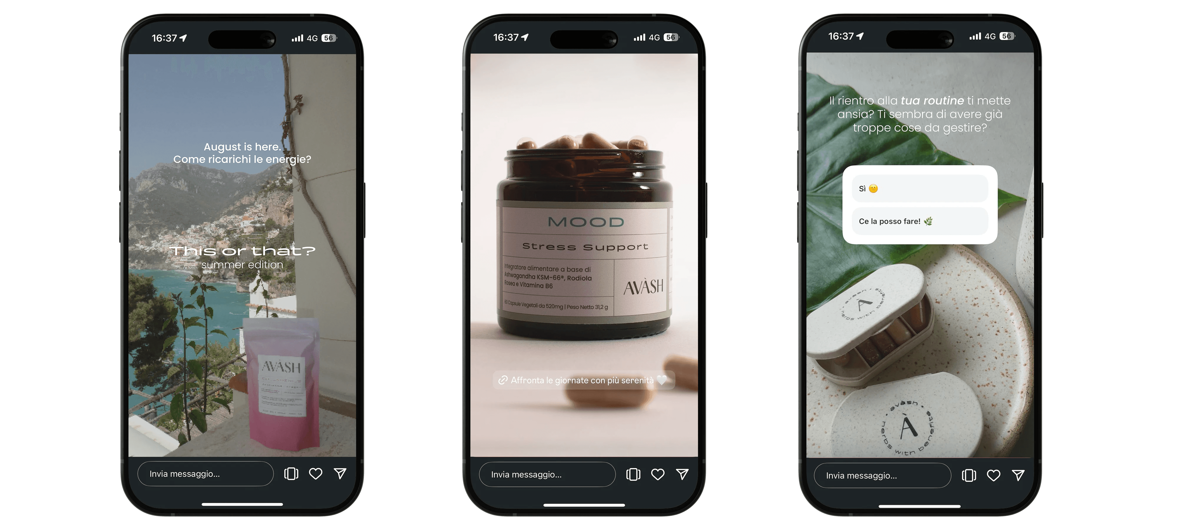 Per loro ci siamo occupate della gestione del profilo Instagram, curando le grafiche di post e storie e impostando una strategia mirata a definire l’identità del feed e del Brand, gettando le basi per la crescita di una community solida. Abbiamo creato contenuti trasversali, non solo incentrati sui loro prodotti, ma che contribuissero a rendere Avàsh un brand aspirazionale.